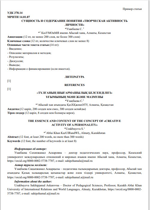 - Если статья на русском языке, то на казахском и английском языках. (См. Пример статьи).