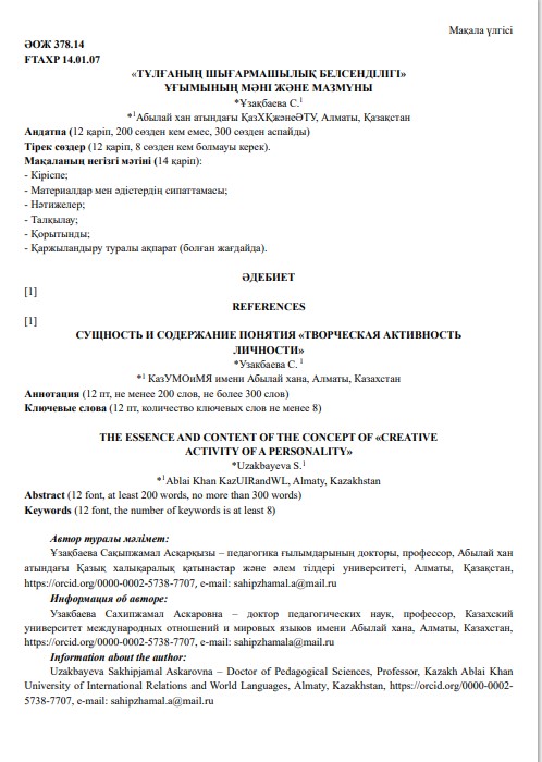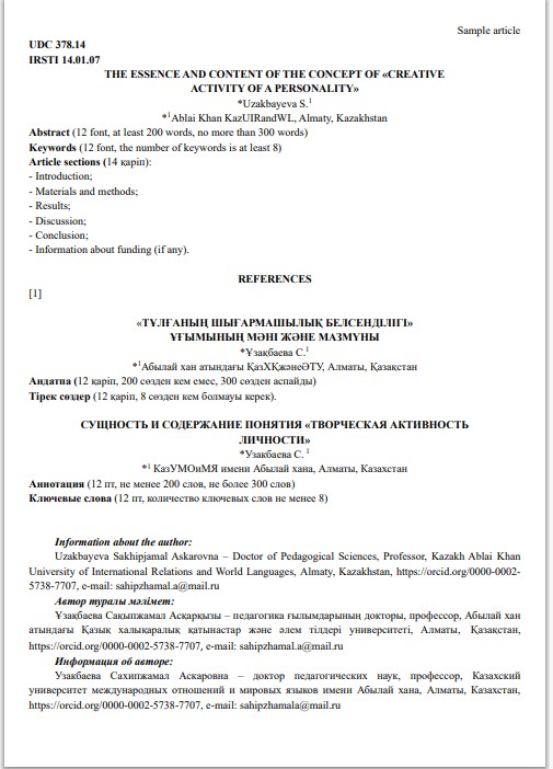 - С целью соблюдения принципа преемственности и интеграции международного опыта авторам рекомендуется ссылаться на публикации, ранее опубликованные в журнале «Известия КазУМОиМЯ им. Абылай хана», а также на материалы из баз данных Scopus и WoS.